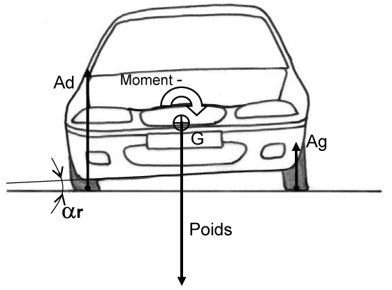 Schéma d\'un véhicule en virage: La répartition des efforts de guidage génère un moment de roulis appliqué au véhicule.