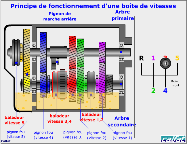 Principe de fonctionnement d'une boite de vitesses en position 1er rapport. Baladeur 1,2 est enclenché sur le pignon fou de vitesse 1.