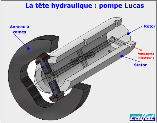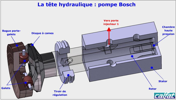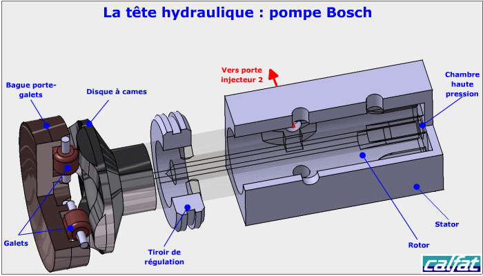 Principe de fonctionnement d'une pompe injection diesel bosch à commande mécanique : phase refoulement vers une sortie d'injecteur.