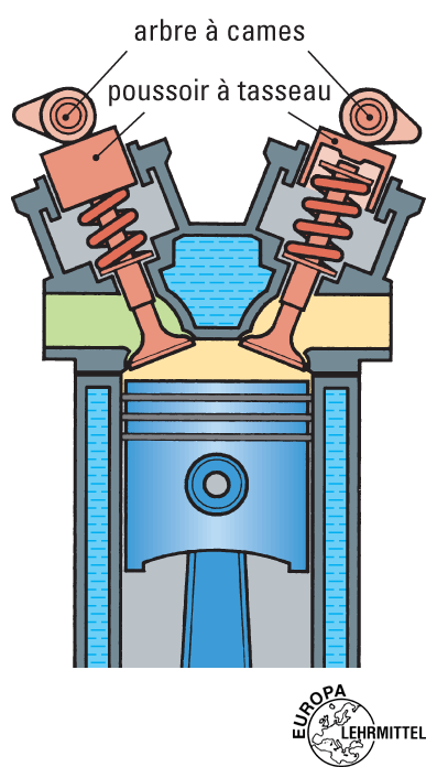 Commande d'ouverture des soupapes par culbuteur avec arbre à cames latéral : Soupape en pleine ouverture.
