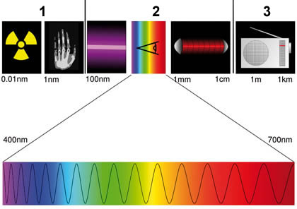 Représentation d\'un spectre électromagnétique montrant les phénomènes qui se produisent lorsqu\'une onde (de différente longueur)rencontre de la matière.
