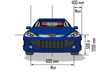 Schéma de la position réglementaire des feux de croisement sur un véhicule.