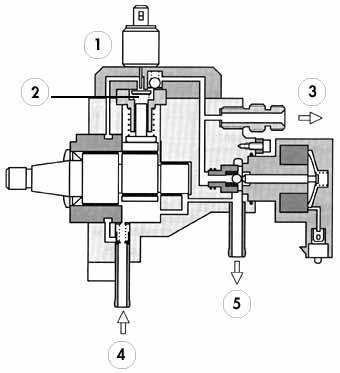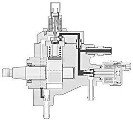 Vue en coupe d'une pompe HP Bosch 1ère génération sur système à rampe commune.