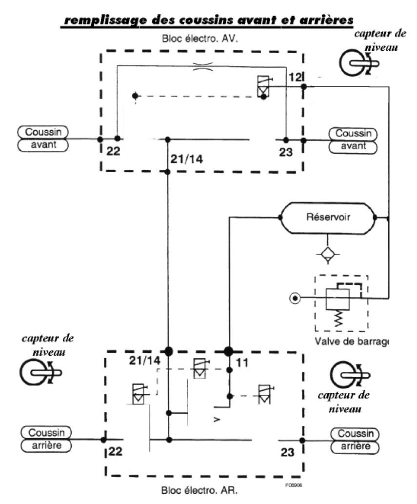 Schéma hydraulique incomplet en phase remplissage des coussins avants et arrières d\'une suspension pneumatique à commande électronique.