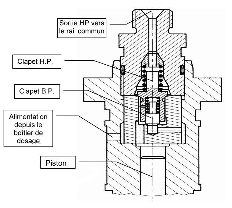 Vue en coupe et détail des éléments de la pompe HP du système Common Rail du véhicule Prémium 420 DCI.