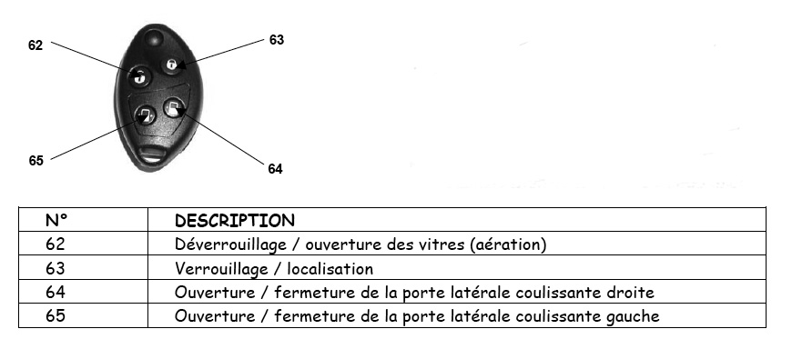 Descriptif des boutons de la télécommande d\'un véhicule à portes coulissantes motorisées.