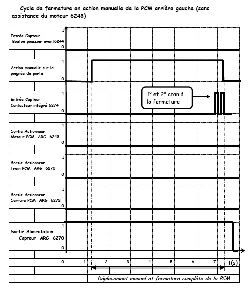 Chronogramme de fermeture en action manuelle (sans assistance du moteur électrique)d\'une porte coulissante motorisée d\'un véhicule.
